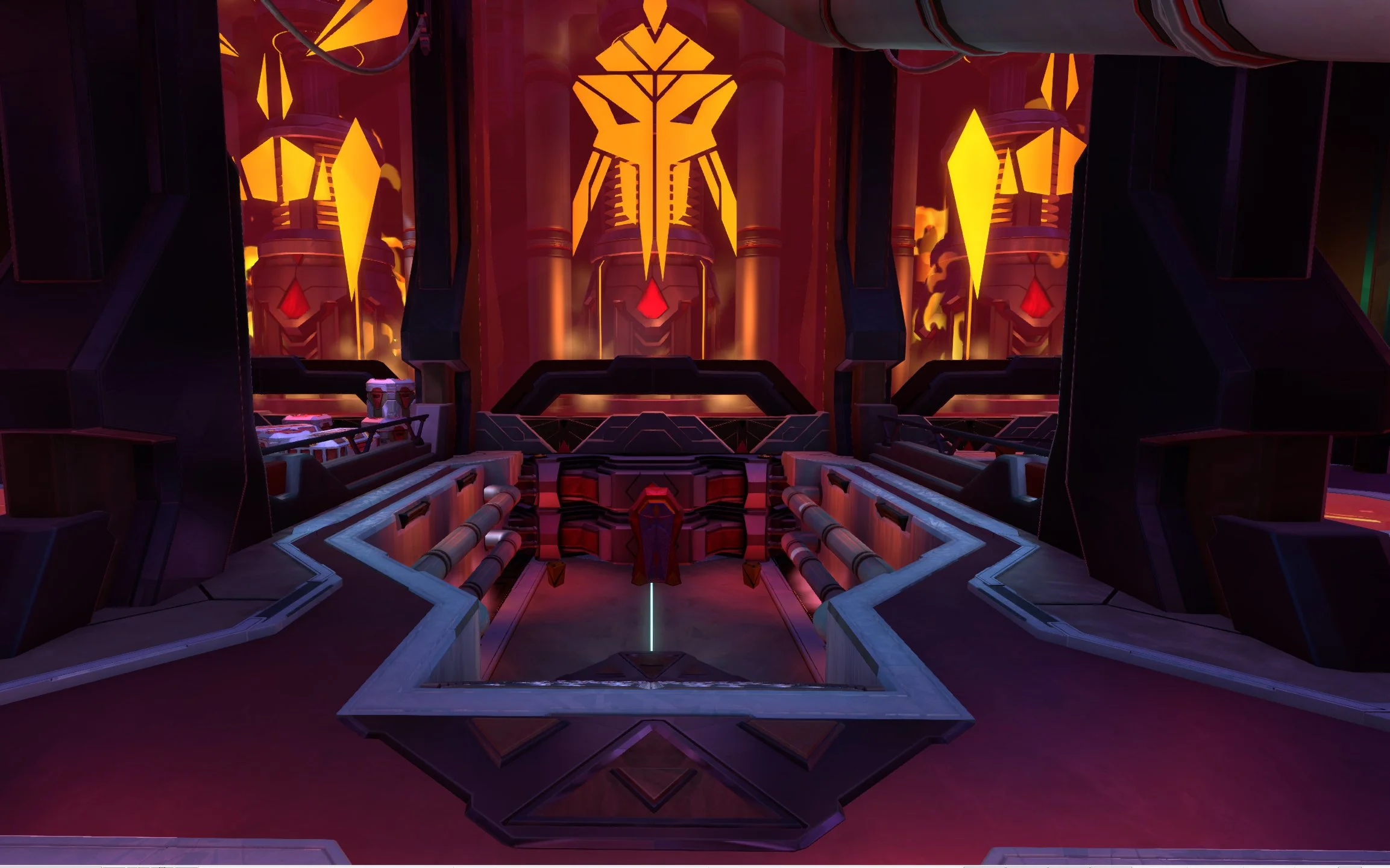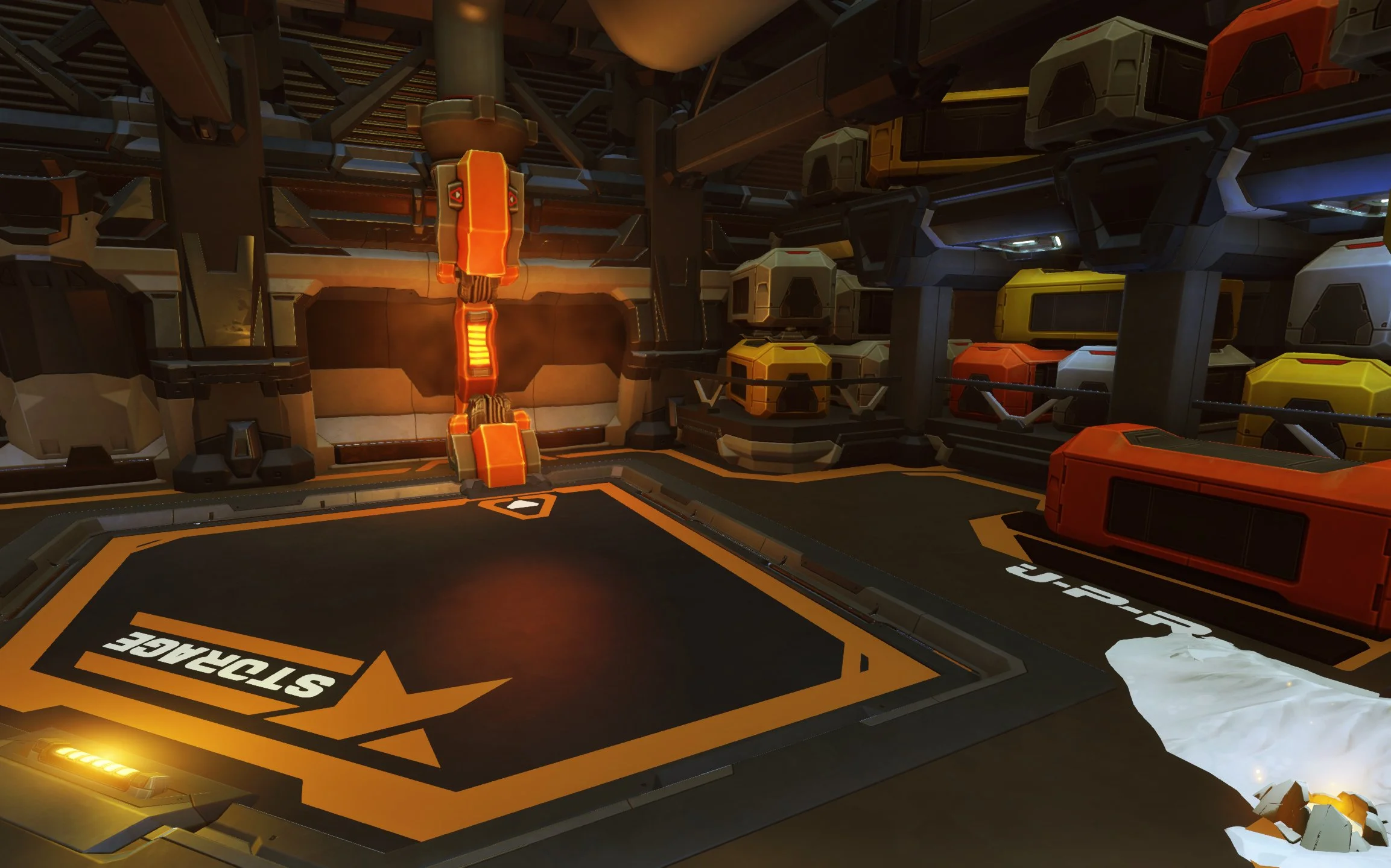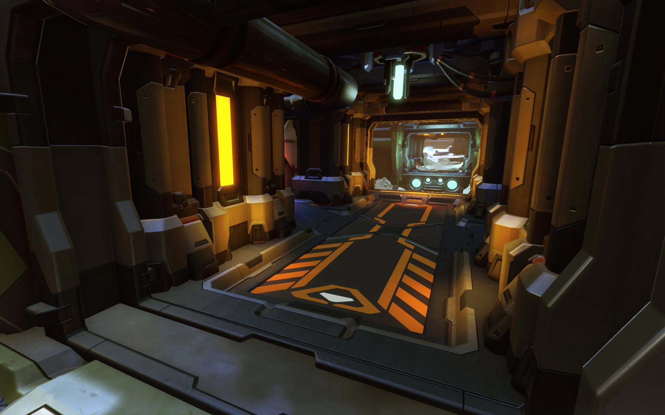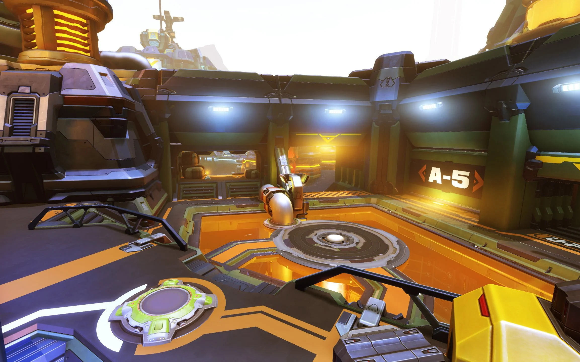 Firstly I wanted to bring more focus to the capture point, but the layout was pretty solid in playtesting, so I didn't want to make any major structural changes. Instead I chose to make the floor transparent and installed a massive energy core underneath it. The bright orange floor created a natural focal point, reminded players which side of the level they were on, and anchored the rest of the space. As an added benefit the energy core made the capture point feel like it was worth capturing.