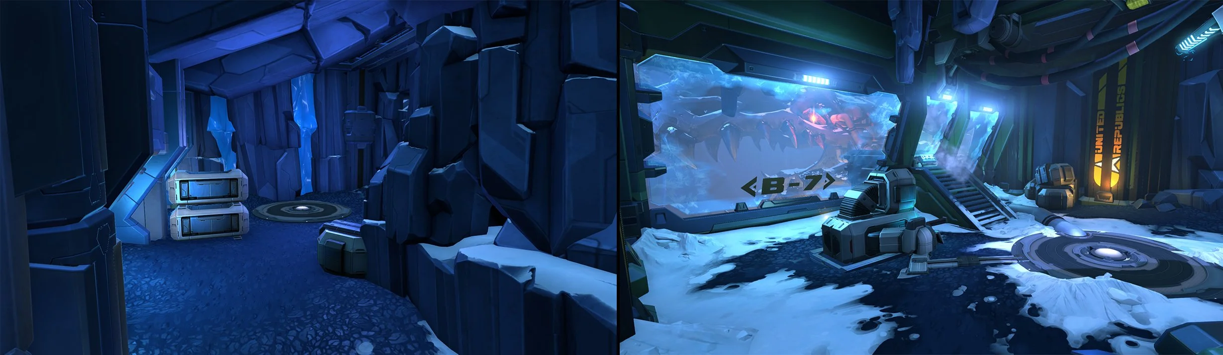 I used fractured lines, drill bits, ice spikes and other dynamic shapes to make this side feel sharp and aggressive. Deco throughout the area was cold themed with snow on the ground, ice, cool colored glass, and falling snow all reinforcing the sensation of cold.