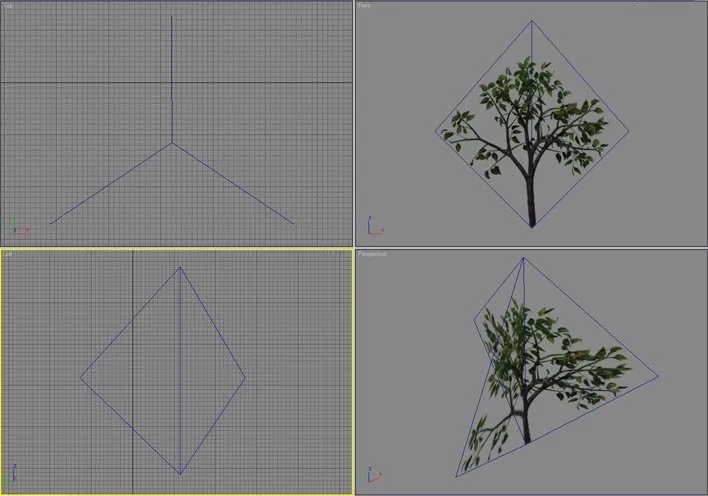Next was to very carefully pack the textures into the tri-foil shape seen below. This change reduced overdraw dramatically compared to traditional quads. Another win was packing trunk and leaf elements into the same texture. While it cost more on the GPU to draw the trunk as masked, the technique cut the draw calls on the CPU in half for each render pass which was an overall win.